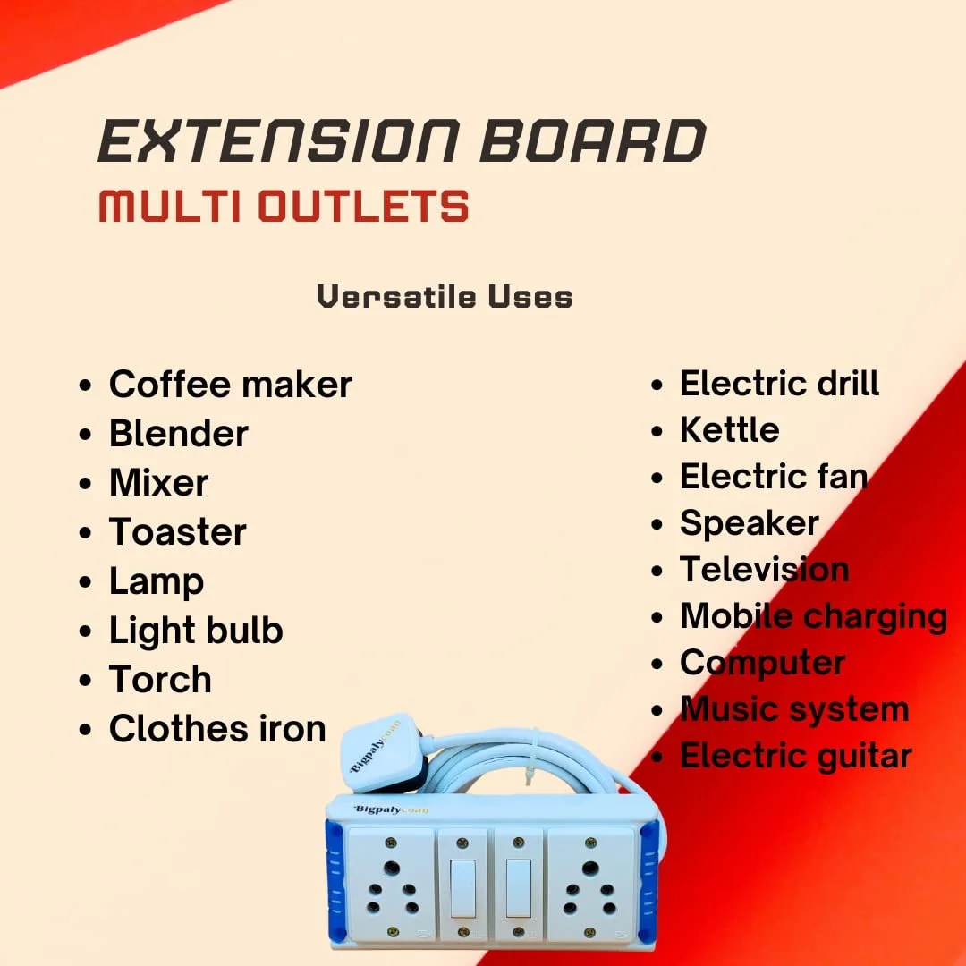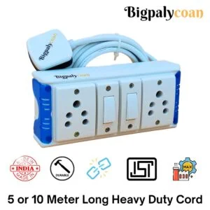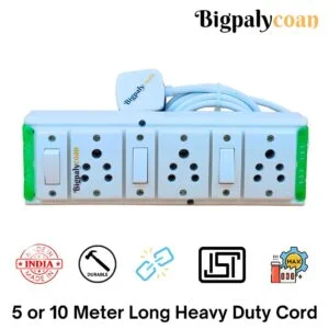 Materials: Bigpalycoan extension board with individual switch is built with ISI marked 6A sockets attached with ISI marked individual 6A switches. This extension board is made of unbreakable white PVC. This contains 3 core pure copper wire of 0.75 mm ISI marked full gauge. Internal wiring is 0.75 mm single core. This power cord is attached with 6A ISI 3 pins plug. Ready to use. Dimension: The dimension of the product is 6 inch X 3 inch X 2 inch. Why choose the Bigpalycoan Extension Box ? Handcrafted products Strong internal wiring High load bearing capacity. Easy and low cost to repair Mounting holes on the back can mounted on wall with Screw and nylon plug ISI marked Wire with ISI 3 pin Power plug. Highly recommended product with limited technical mastery An Popular Branded product 10+ years old brand of West Bengal. 1000+ Extension Boards to choose from Genuine 12 months replacement warranty. Claim it from the brand website. MADE IN INDIA